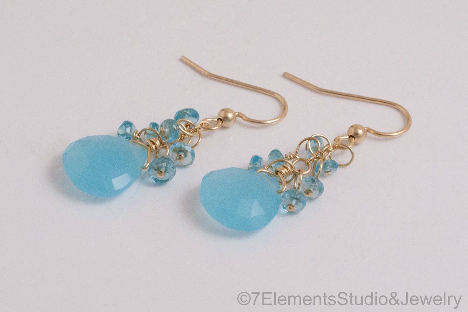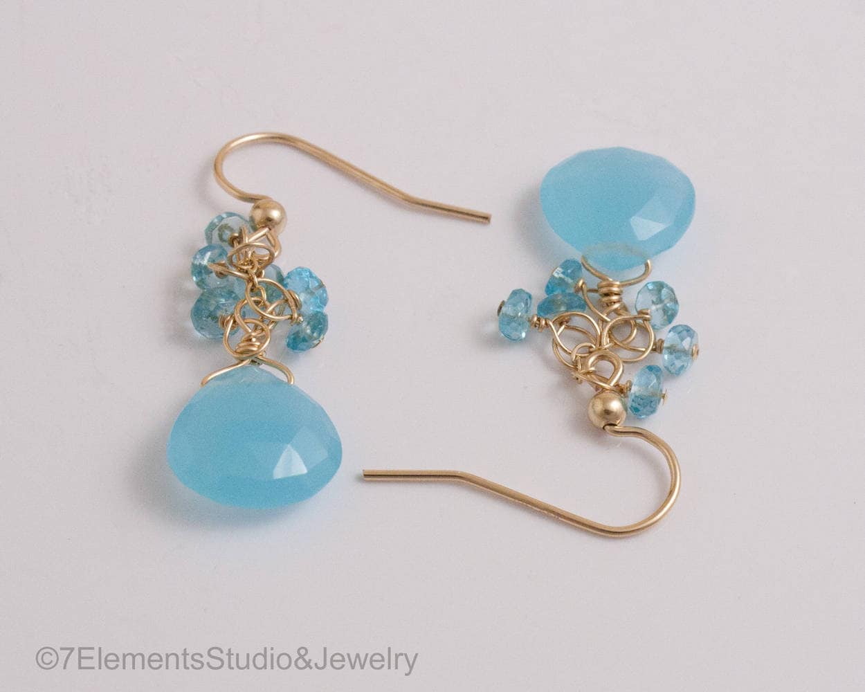 14K Gold Fill Drop Earrings with Blue Chalcedony Briolettes and Clusters of Matching Blue Apatite Gems