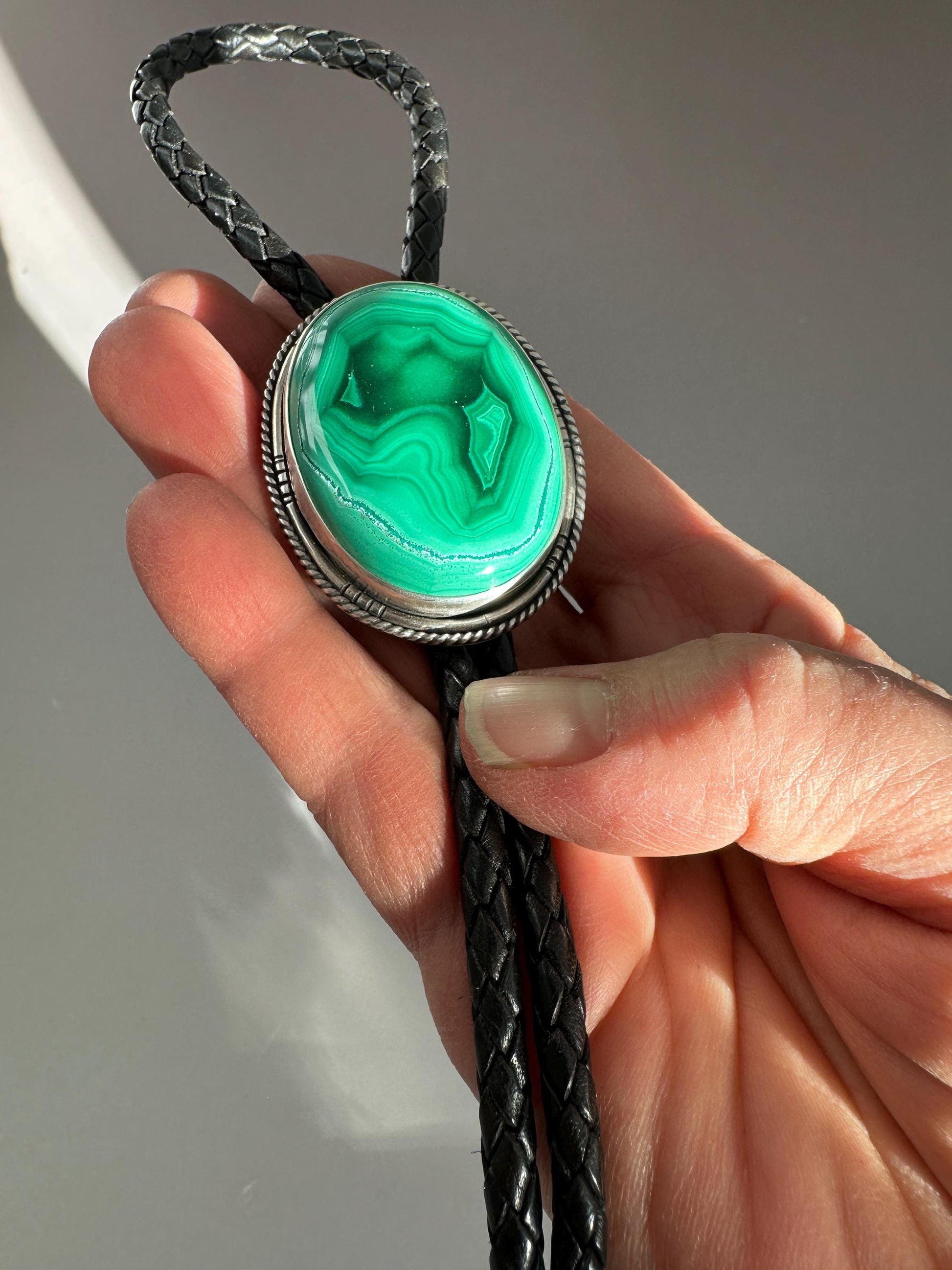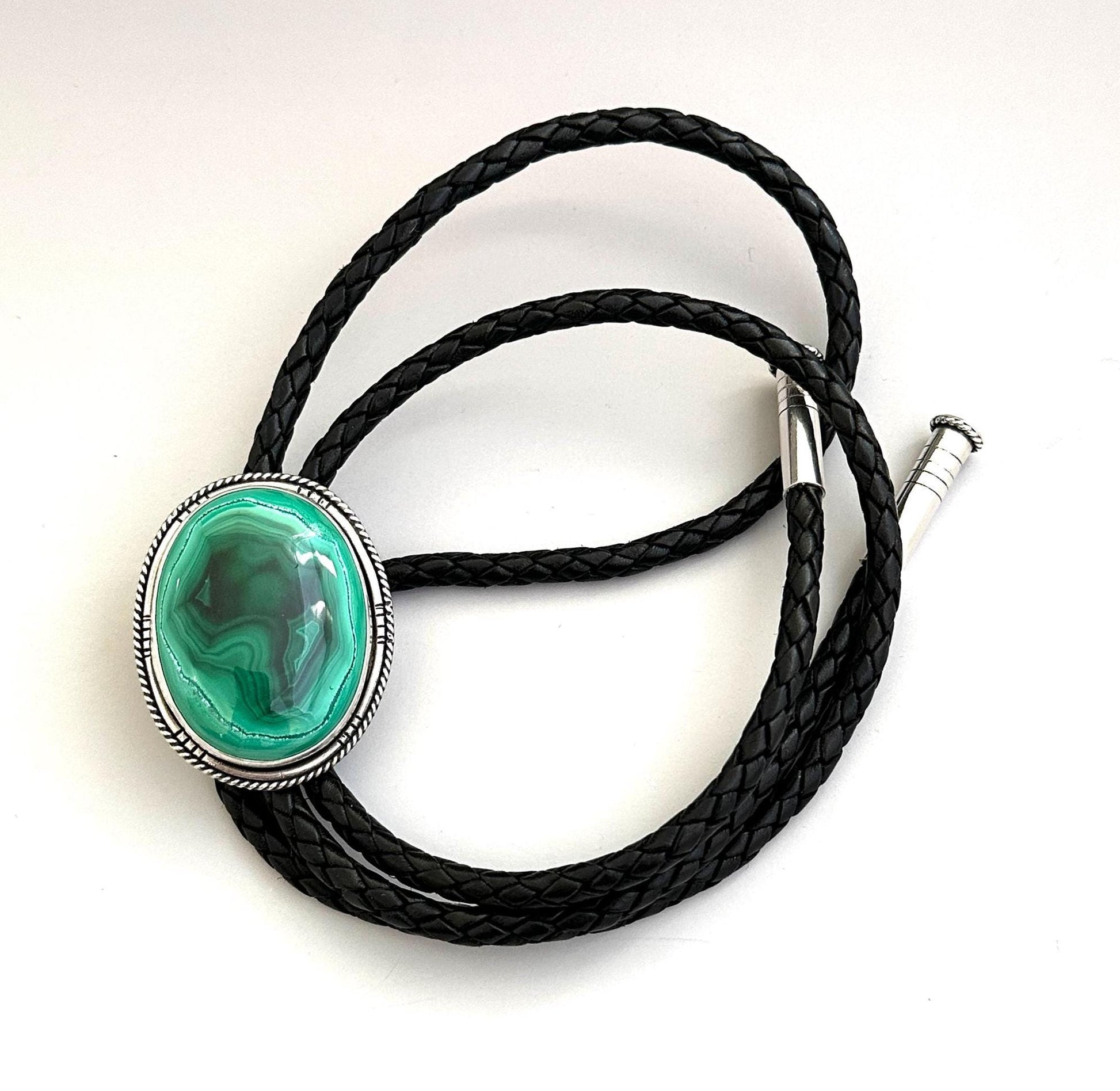 Rich with natural character and grounded in heritage style, this malachite and sterling silver bolo tie is a bold expression of the Southwest. The deep green bands of genuine malachite ripple like desert canyons after rain, while a hand-formed sterling silver setting frames the stone with clean, modern lines.