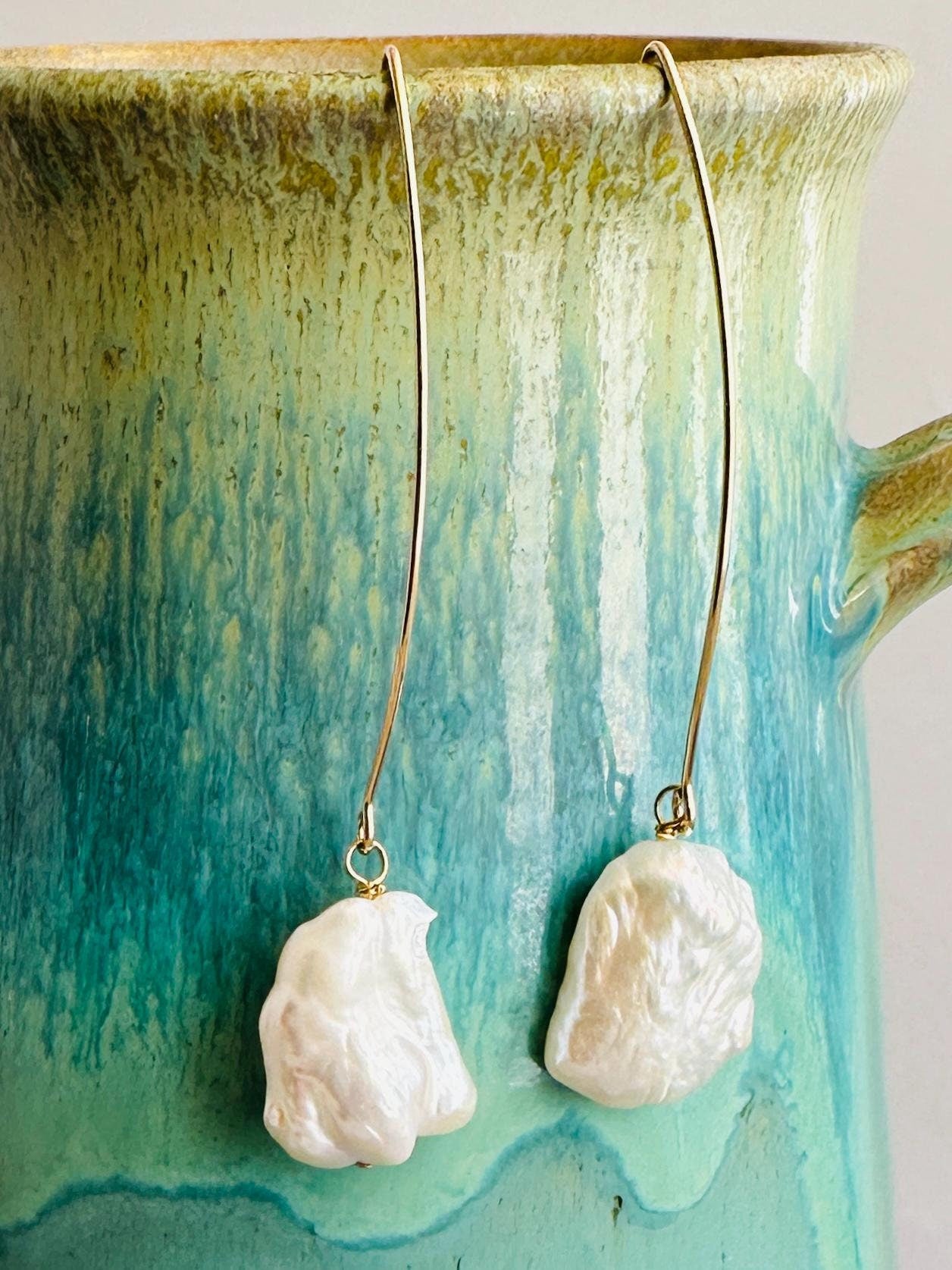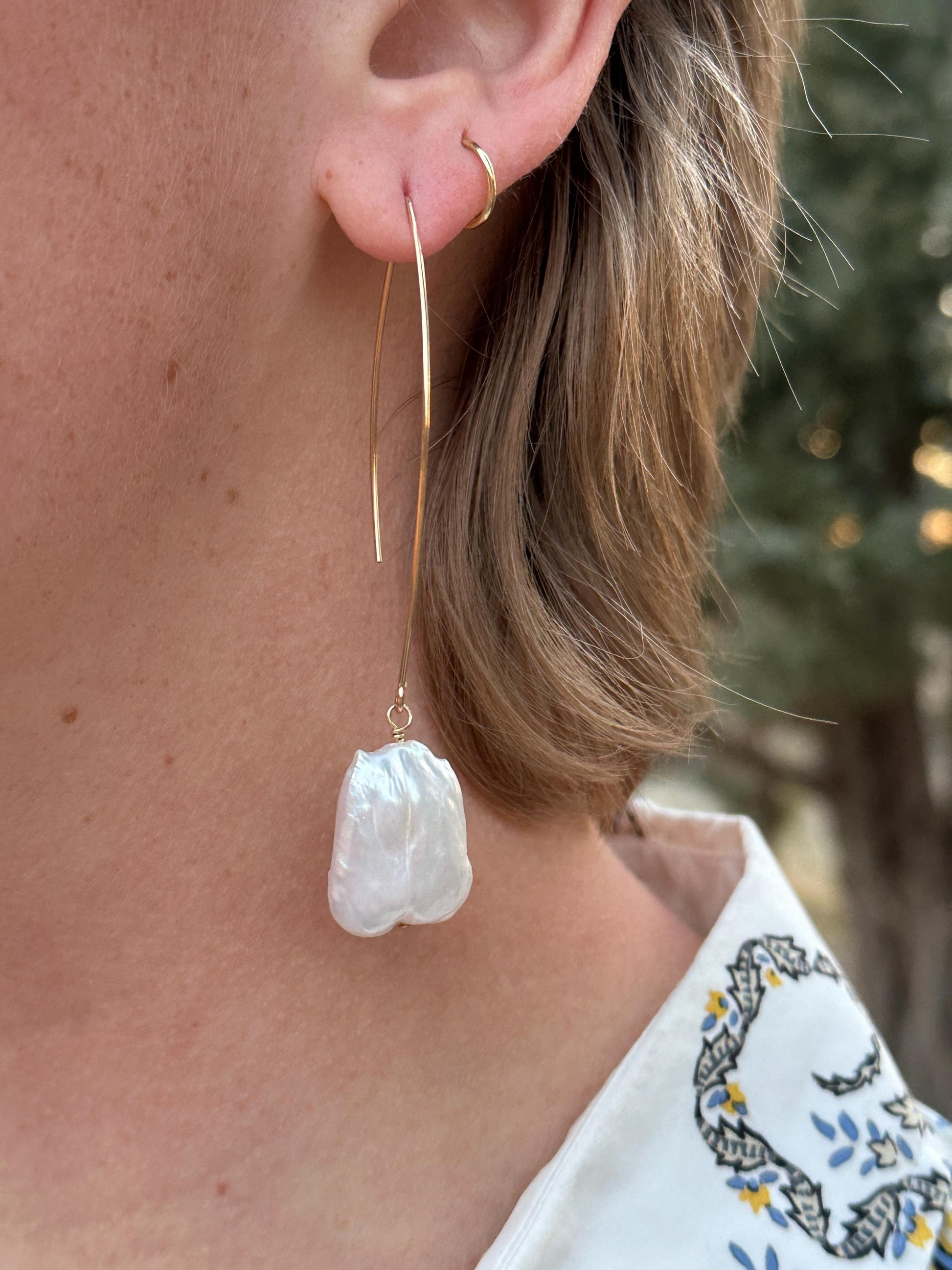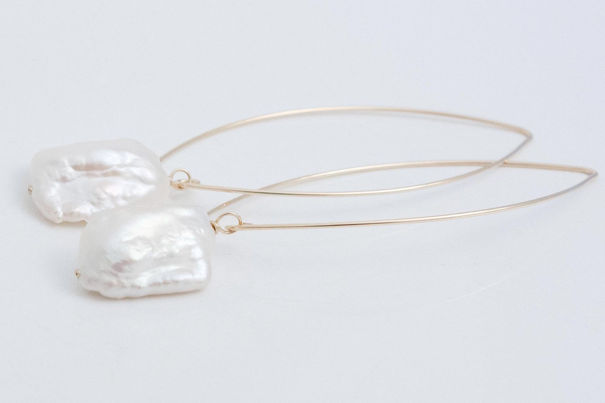 These handcrafted earrings feature luminous white keshi pearls suspended from sculptural 14K gold-filled wire, creating a dynamic and modern silhouette. Keshi pearls are prized baroque pearls celebrated for their petal-like forms and radiant luster, making each pair truly one-of-a-kind with natural, irregular shapes that reflect the beauty of imperfection. The 14K gold-filled components provide durability and a luxurious finish, ensuring these earrings remain a cherished part of your collection.