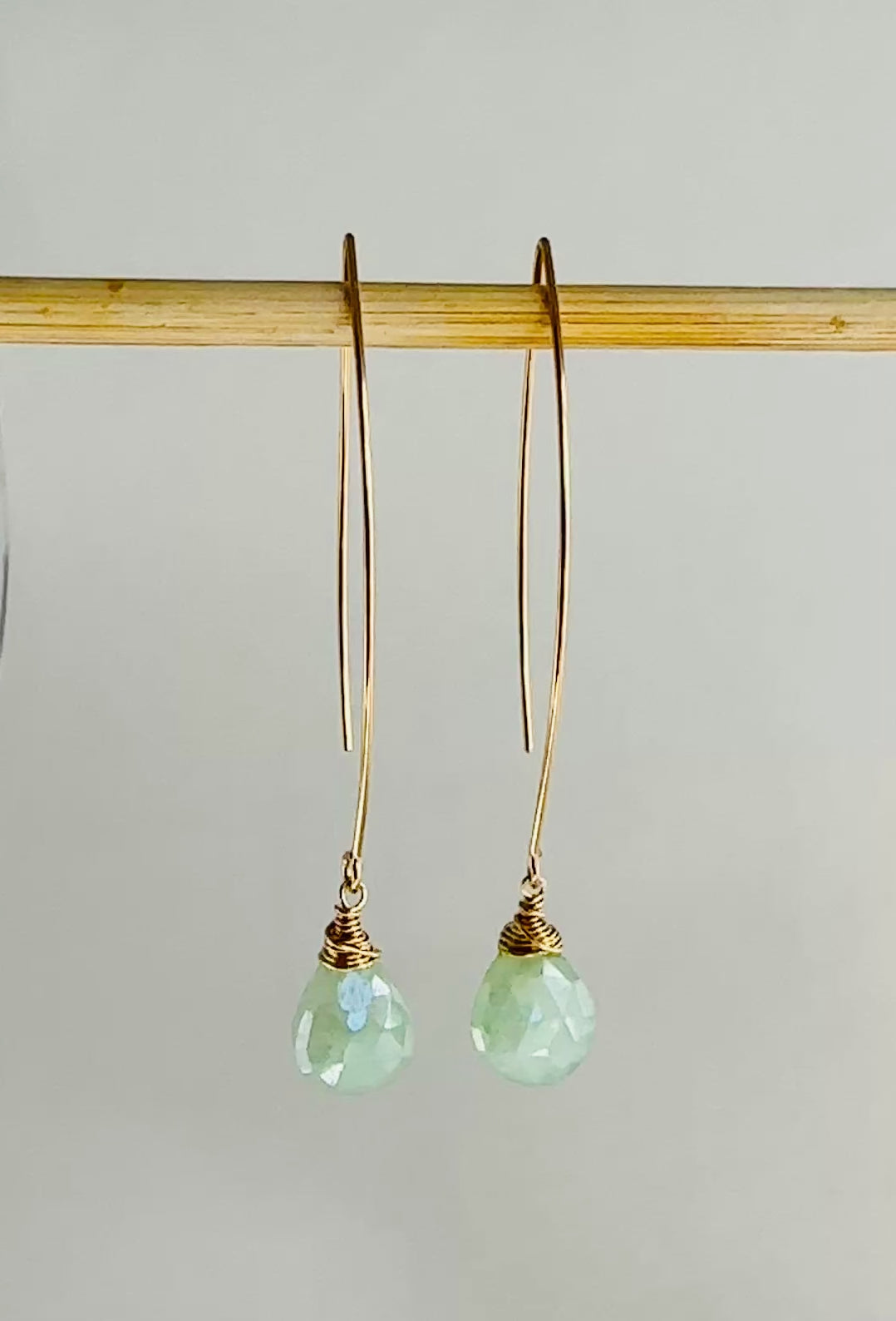 These handcrafted earrings feature luminous green chalcedony gemstones suspended from curved 14K gold-filled earwires, offering a timeless elegance suitable for any occasion. Celebrated for its soothing energy, green chalcedony is believed to promote harmony and balance. These earrings are like a vacation for your ears, radiating sunlit warmth, breezy elegance, and the calming beauty of a faraway escape.