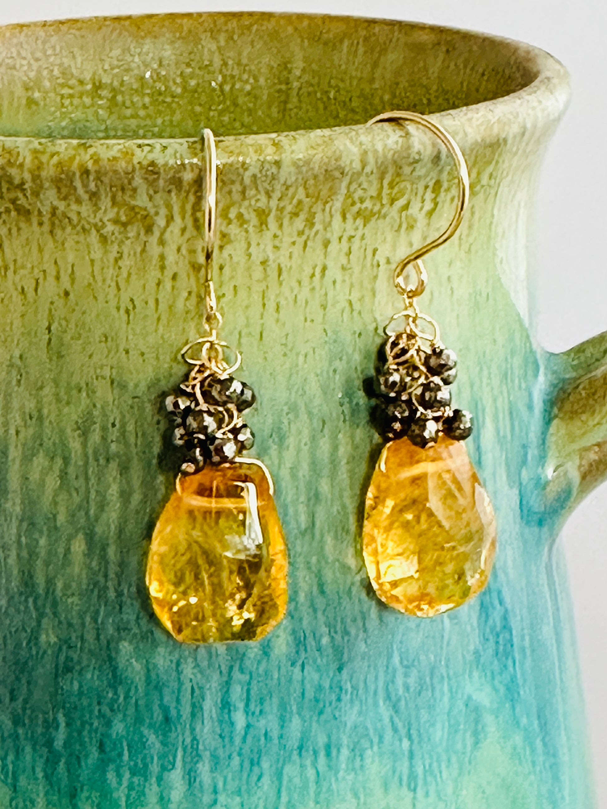 These earrings are a captivating blend of warmth and edge, handcrafted to bring both elegance and energy to your jewelry collection. These earrings feature hand-cut citrine drops that radiate golden light, paired with shimmering pyrite clusters, all suspended from 14K gold-filled earwires. These earrings are versatile enough for both everyday wear and special occasions, making them a thoughtful gift for birthdays, anniversaries, or as a treat for yourself. As citrine is November's birthstone, they hold additional significance for those born in that month.