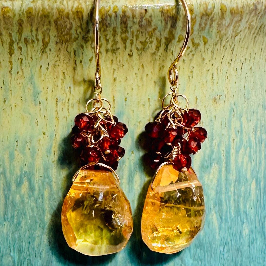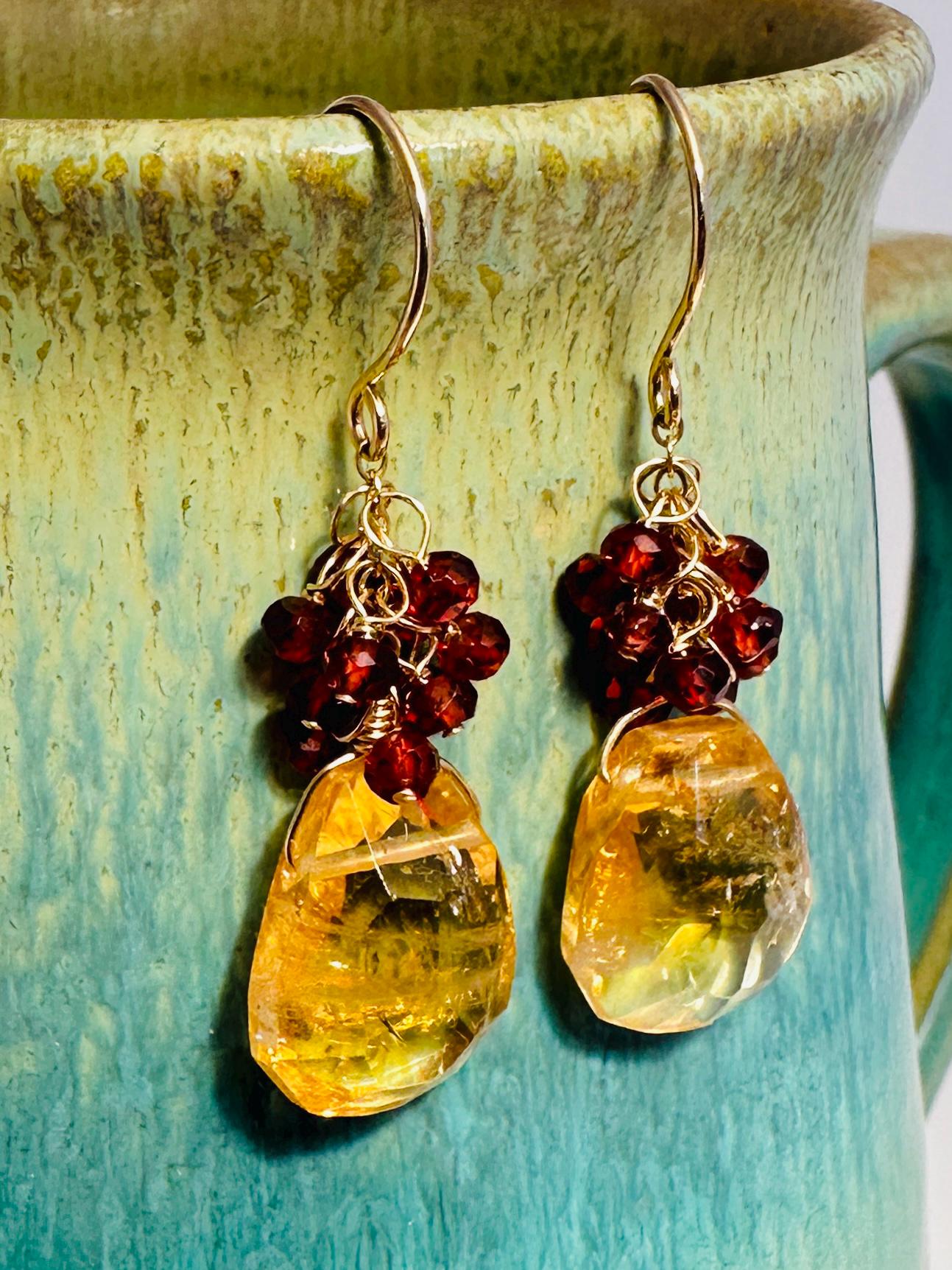 Citrine Sway Earrings with Red Garnet Clusters and 14K Gold Fill Earwires, Citrine and Garnet Gemstone Drop Earrings
