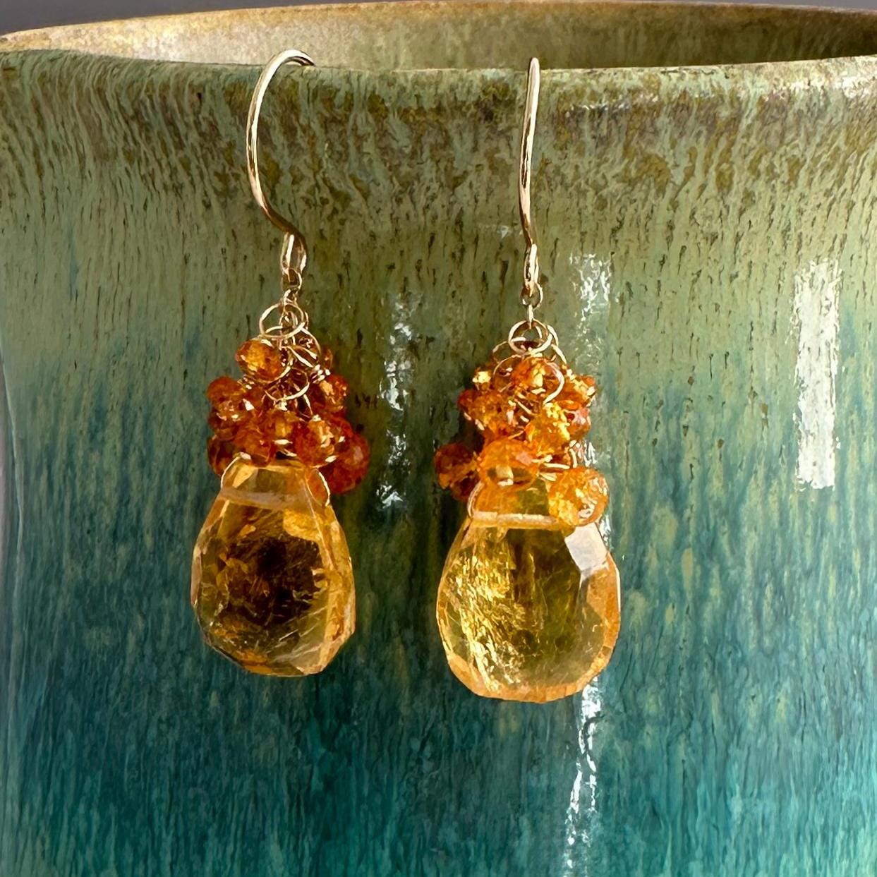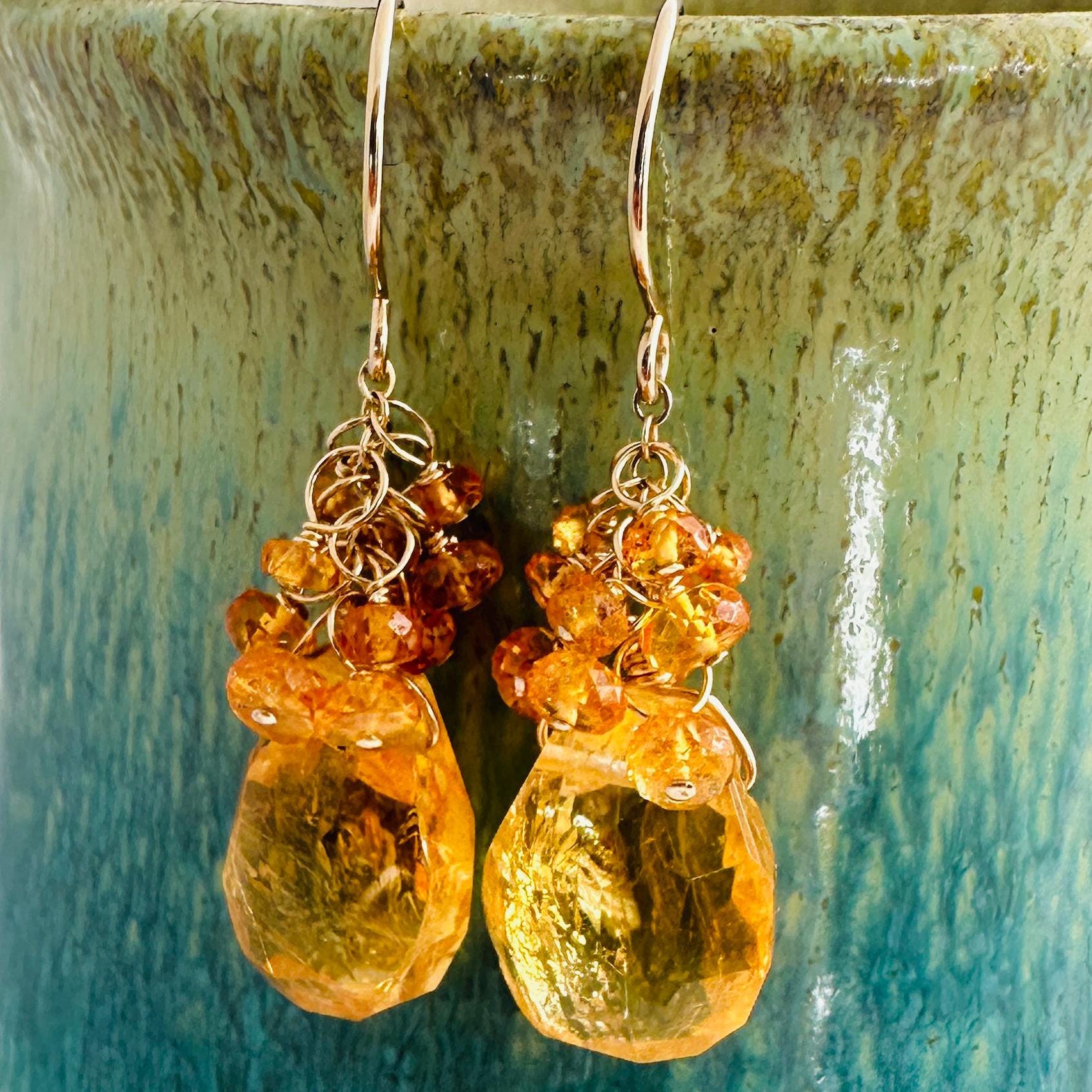 Citrine Sway Earrings with Spessartite Garnet Clusters and 14K Gold Fill Earwires, Citrine and Spessartite Gemstone Drop Earrings