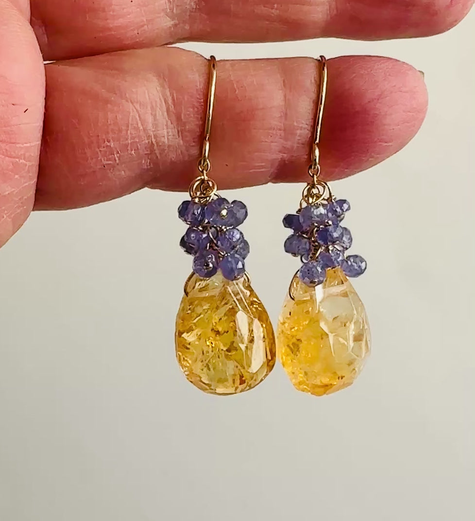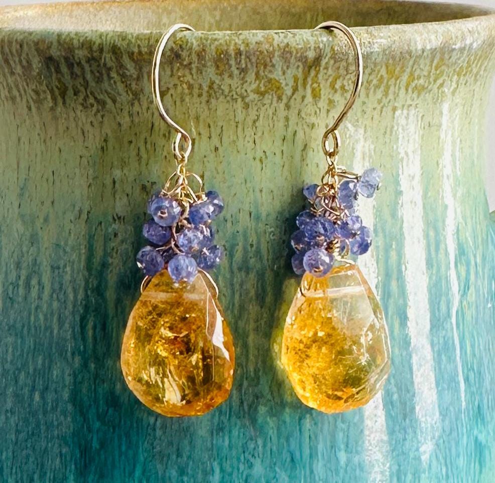 Citrine Sway Earrings with Tanzanite Clusters and 14K Gold Fill Earwires, Citrine and Tanzanite Gemstone Drop Earrings