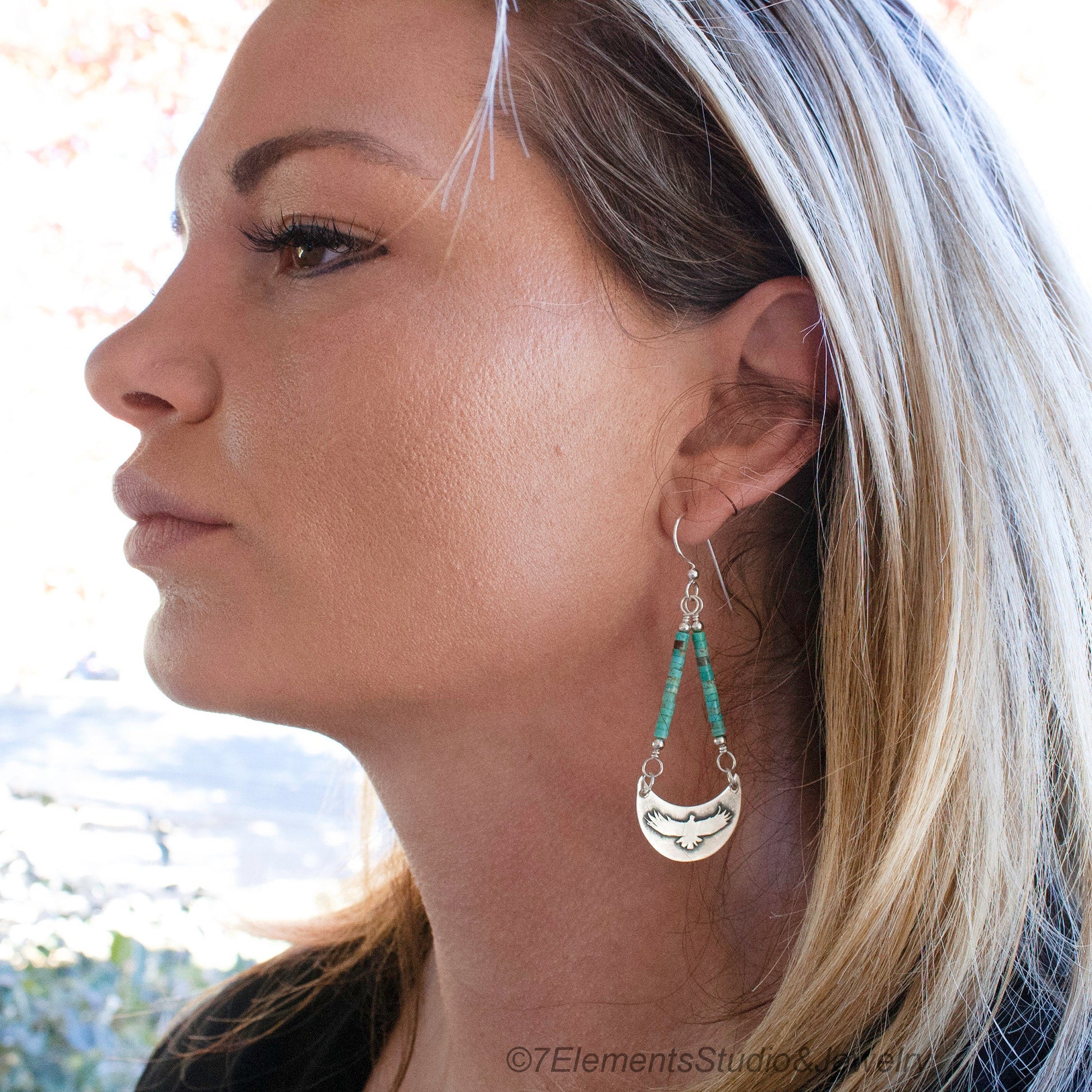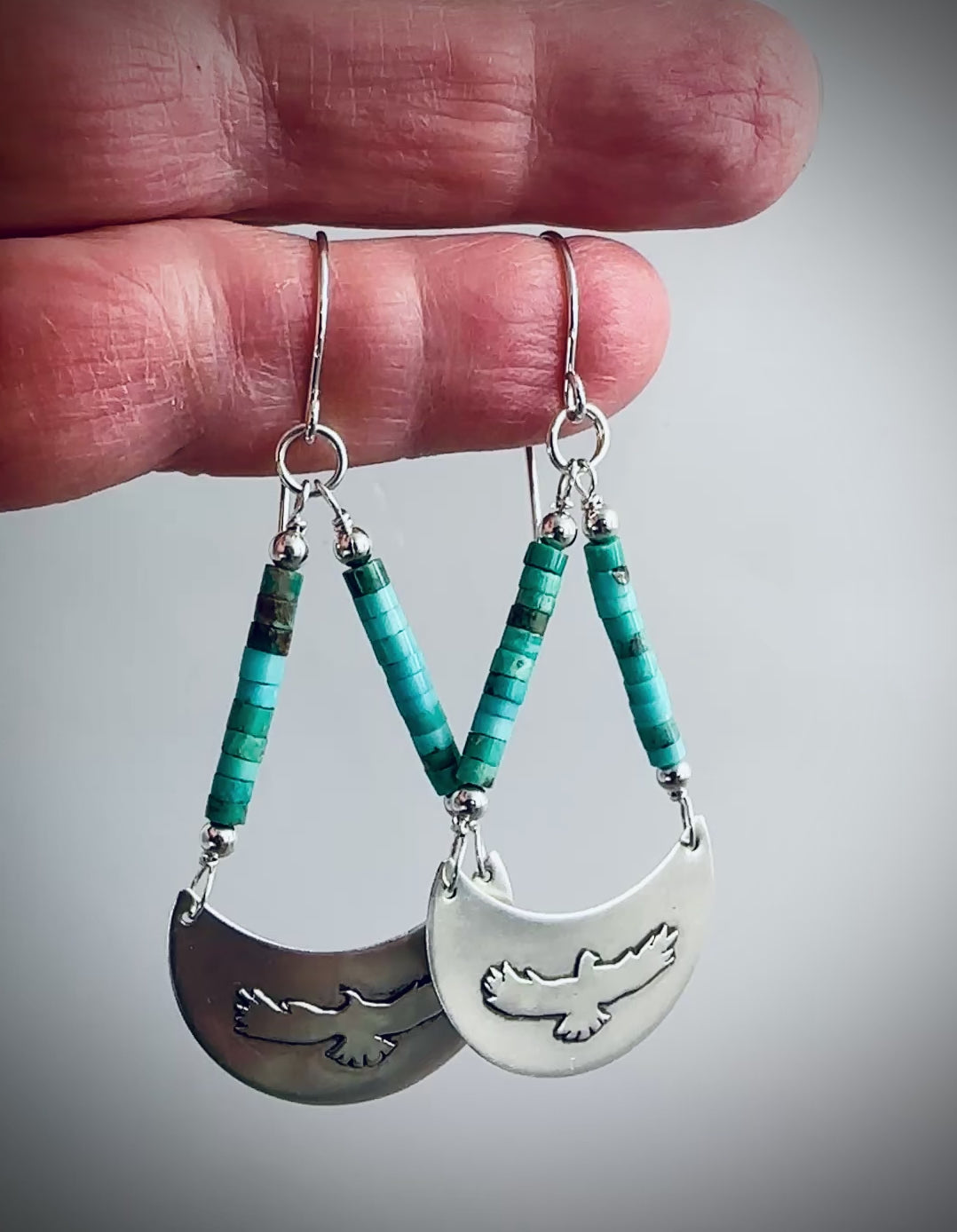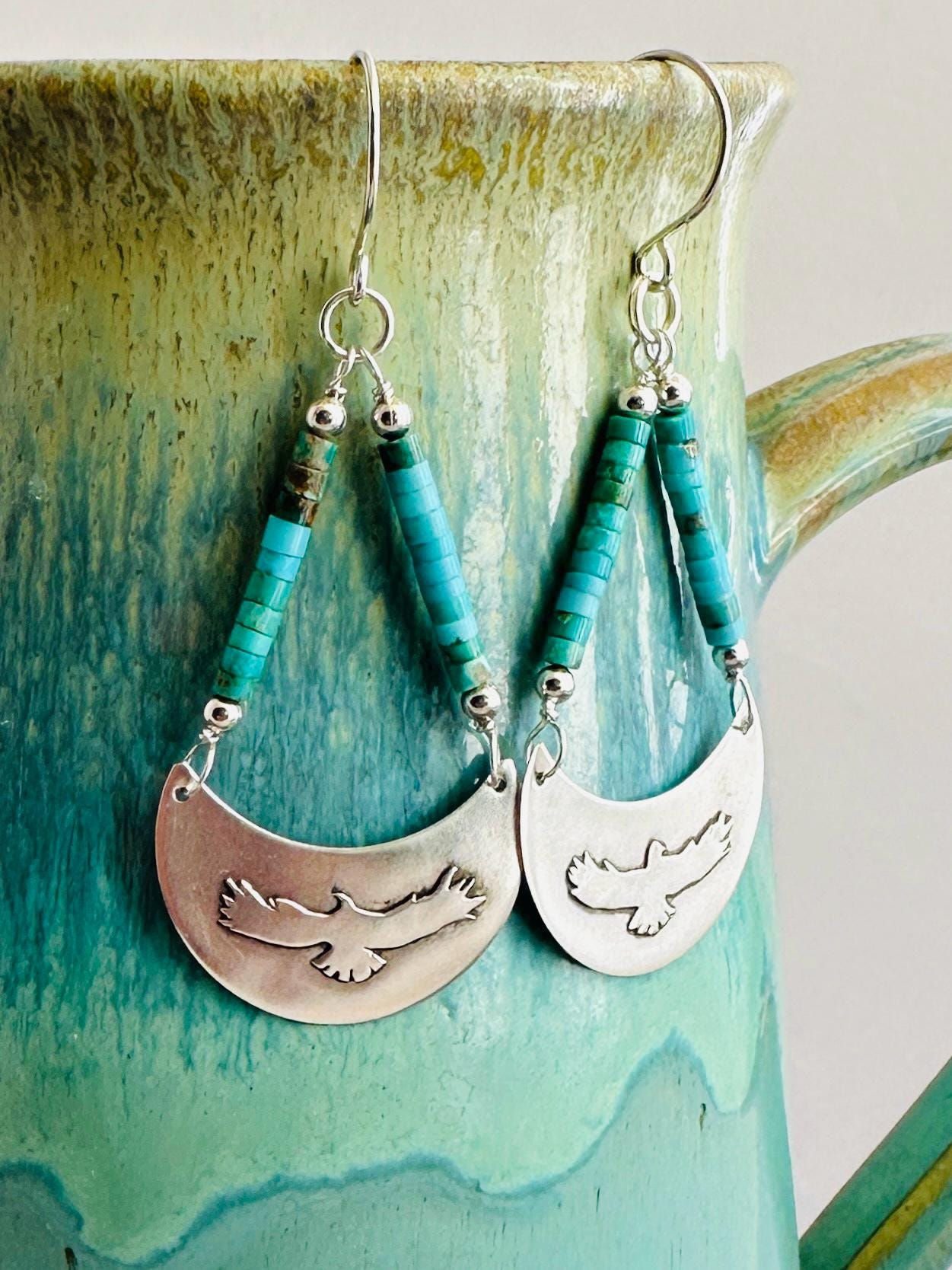 These handcrafted earrings feature crescent-shaped Argentium Silver frames, each adorned with a hand-sawn and fused eagle silhouette, symbolizing freedom and vision. Accentuated with vibrant turquoise beads, they capture the essence of desert skies and open landscapes. Each pair is a testament to skilled artistry, reflecting the beauty of the natural world and the majesty of the eagle. The Arizona turquoise accents add a touch of color, reminiscent of clear desert skies.