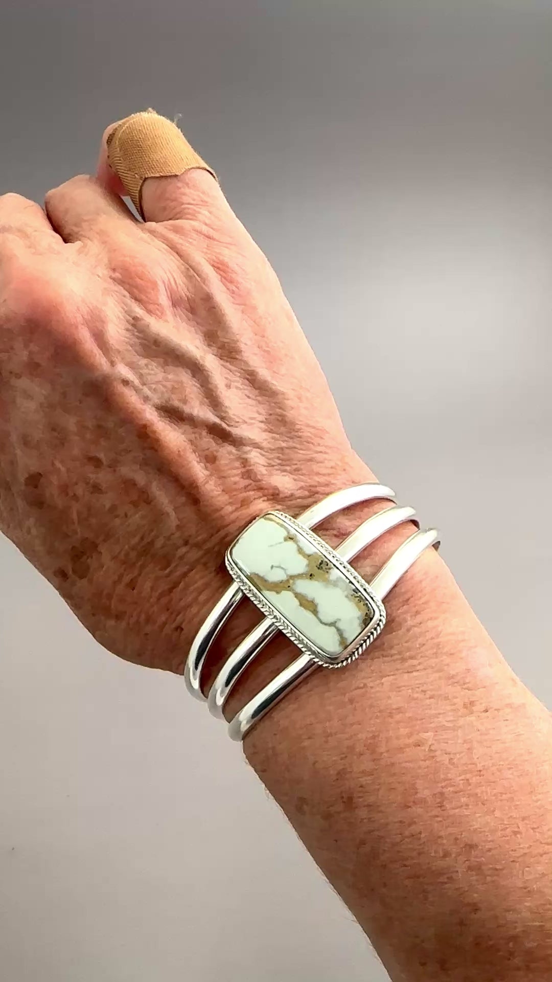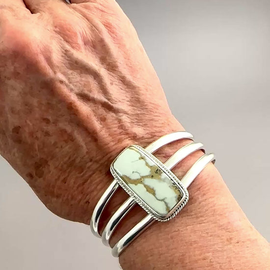 Yummy off-white Emerald Basin Variscite (Nevada) and sterling silver 3-wire cuff with fine rope detailing. Stone is approximately 1/2" x 1 3/16". Cuff is 1" wide.