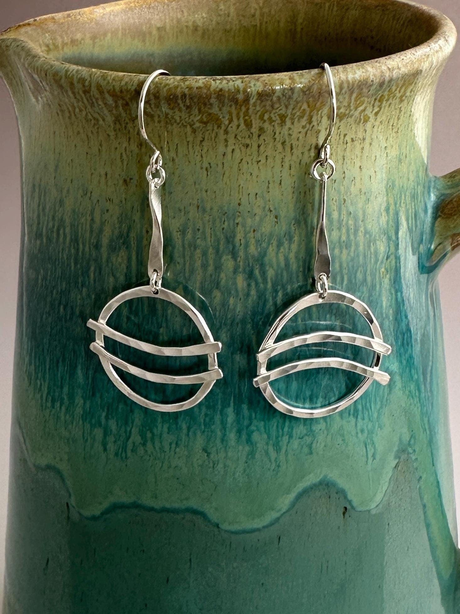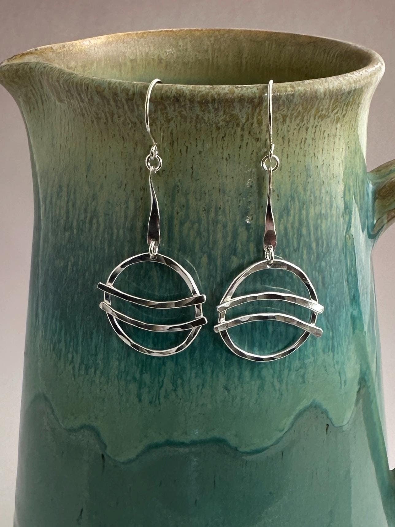 Embrace the rhythm of life with the "Go With the Flow" hammered argentium silver earrings. These earrings feature circular discs with a hammered texture, adorned with parallel bars and twisted wire accents, symbolizing the fluidity and movement of water. Their unique design makes them a standout accessory for those who appreciate artistry and symbolism.