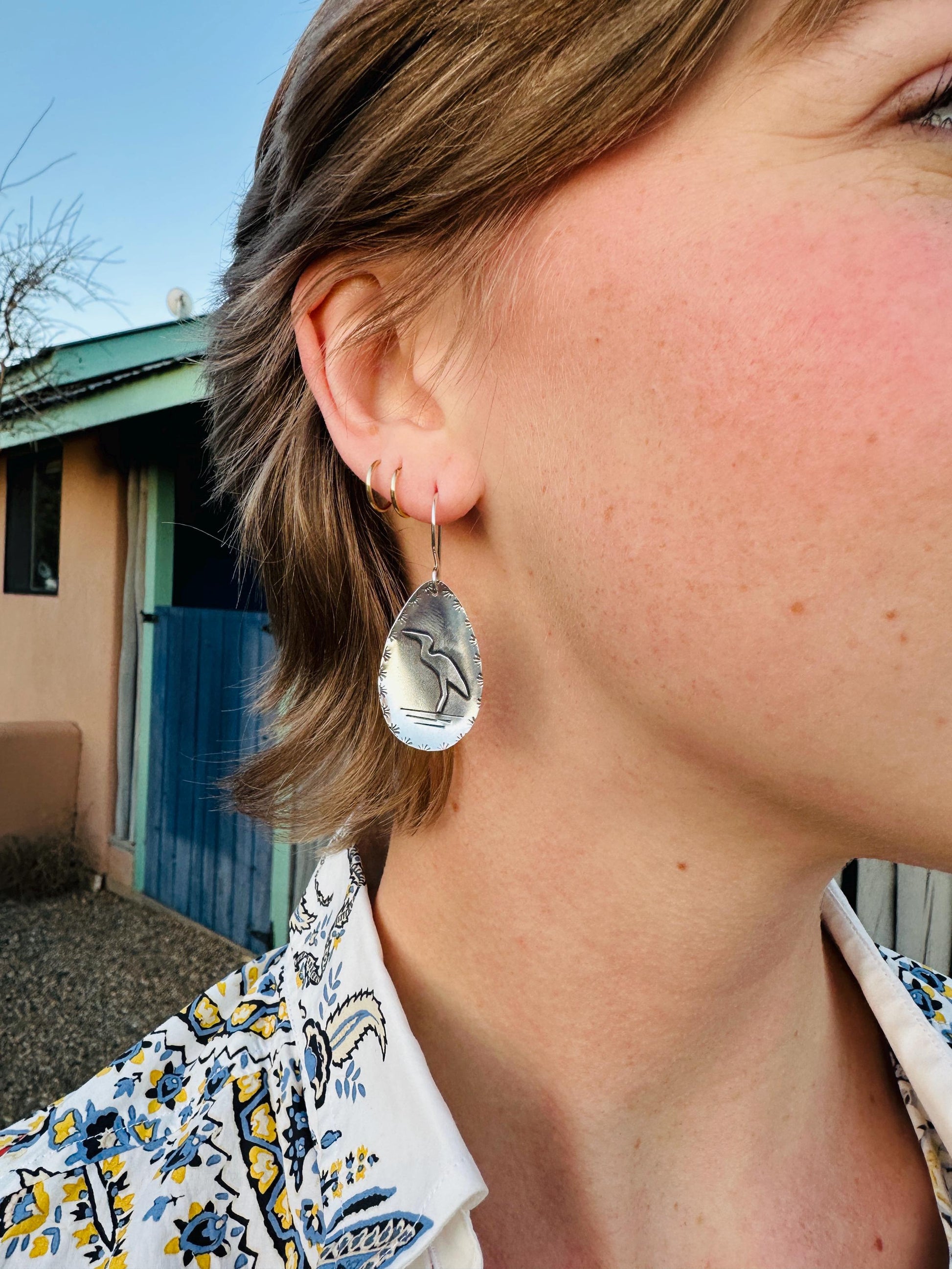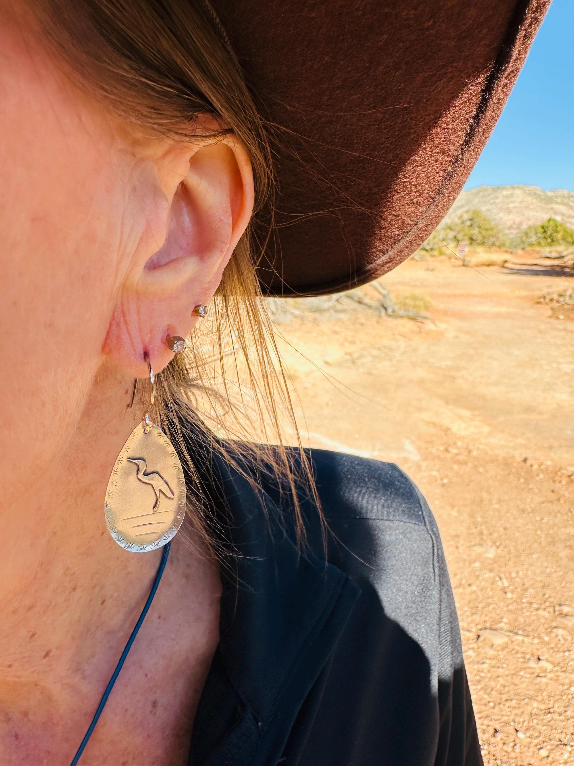 The Great Blue Heron, a symbol of tranquility and grace, is beautifully captured in these earrings, making them a perfect accessory for those who find peace in nature's presence. These silver teardrop-shaped earrings feature a hand-stamped pattern that frames the fused hand-sawn silhouettes of Great Blue Herons. Often seen on local outings, my heart still races a little each time I glimpse their graceful presence along a shoreline. Whether you're a birdwatcher, a lover of the outdoors, or someone who values the beauty of wildlife, these earrings serve as a timeless reminder of nature's elegance.