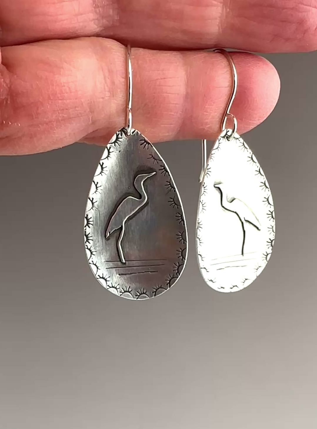 Great Blue Heron Argentium Silver Earrings, Fused Silver Teardrop Earrings with Heron Silhouettes and Hand-stamped Border