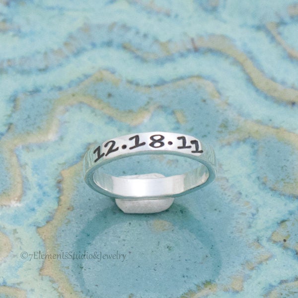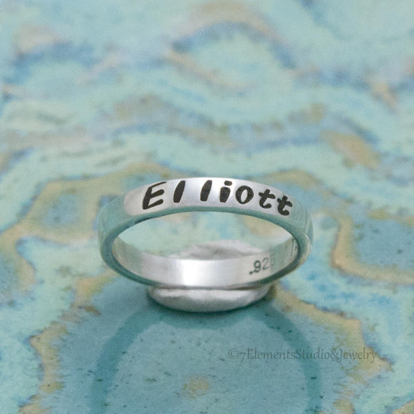 Honor what’s closest to your heart with this sleek, modern design with meaningful customization. This ring features a slight dome and rolled edges for a comfortable fit. Each letter is hand-stamped into the silver and darkened with a hand-applied patina, creating a bold contrast that highlights your personal message. (24 Character Max Per Band)