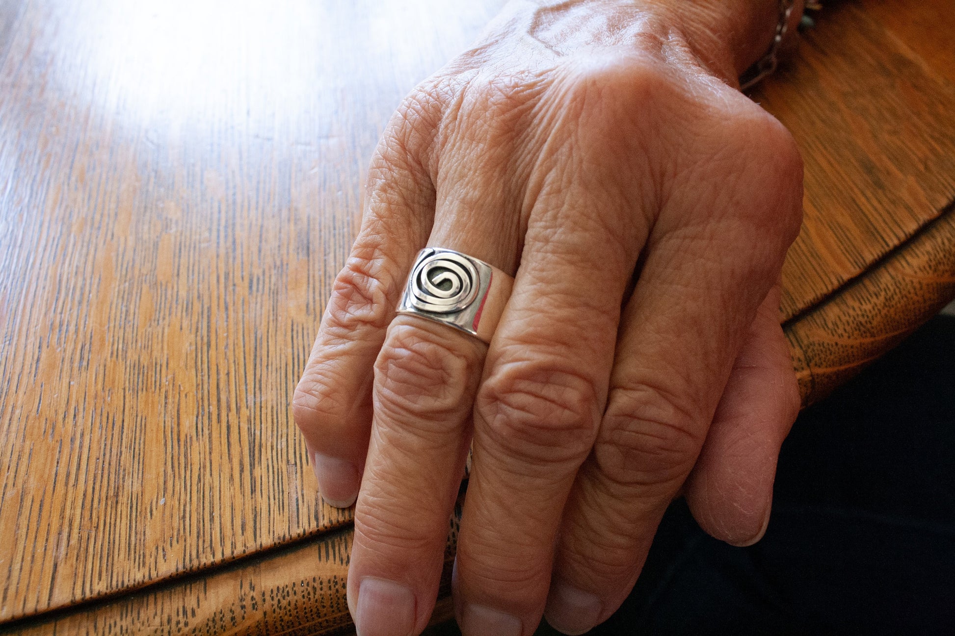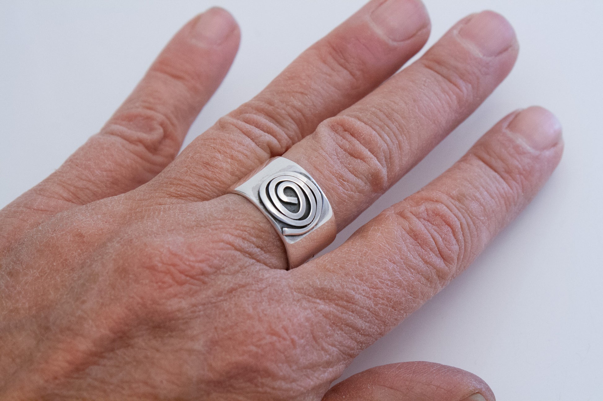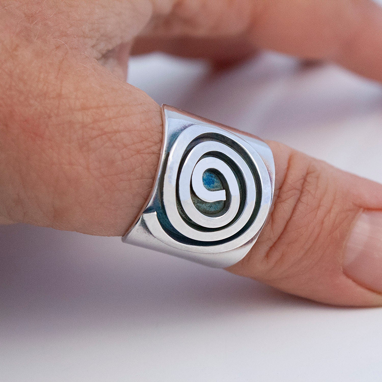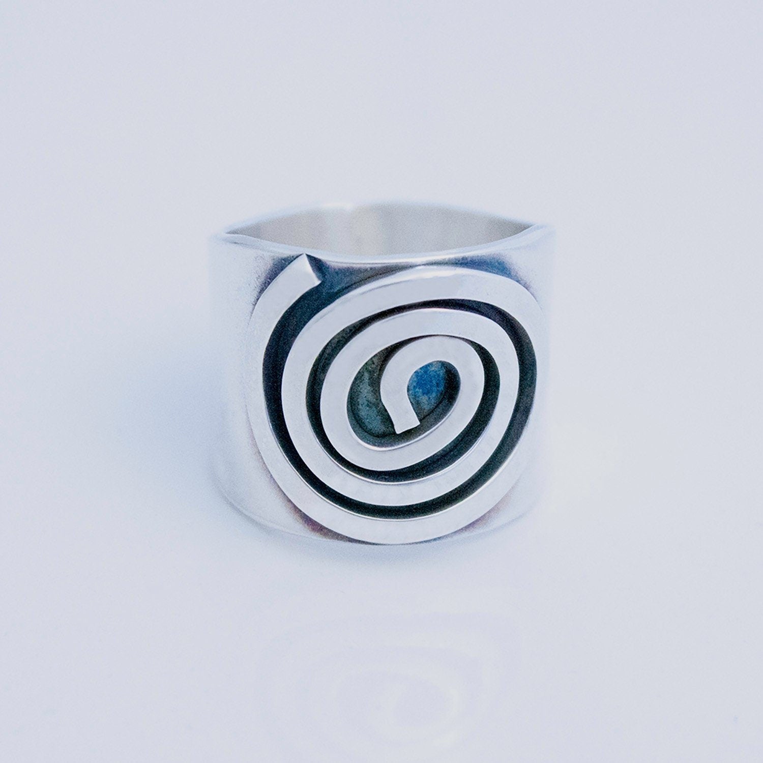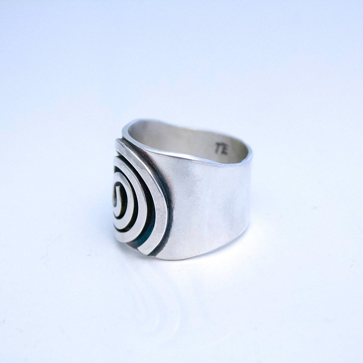 Embrace the timeless allure of the spiral with this handcrafted sterling silver ring. Symbolizing growth, evolution, and the journey of life, the spiral motif is deeply rooted in ancient cultures and spiritual traditions. This wide-band ring showcases a bold, dimensional spiral design that captures the essence of continuous movement and transformation.