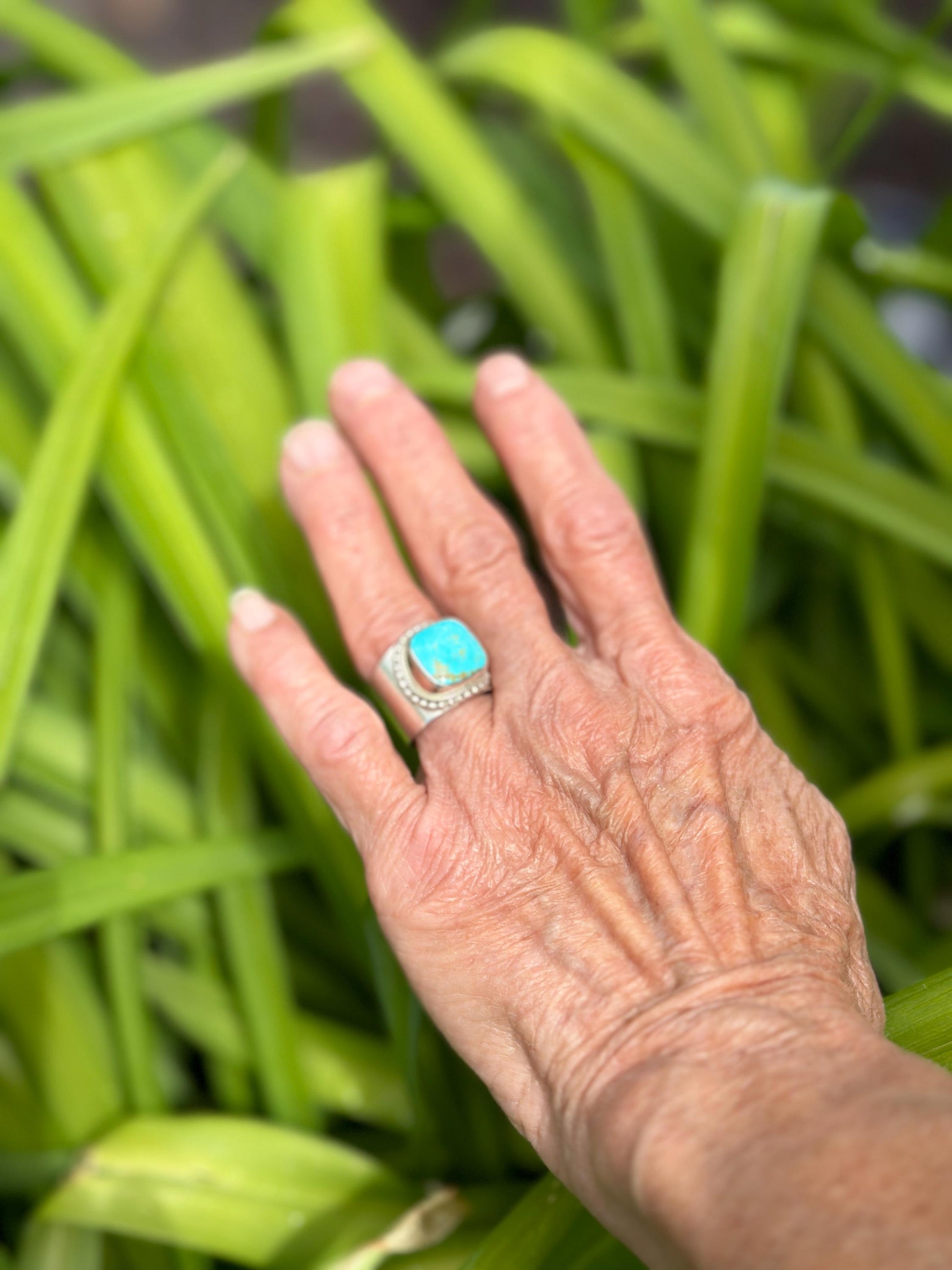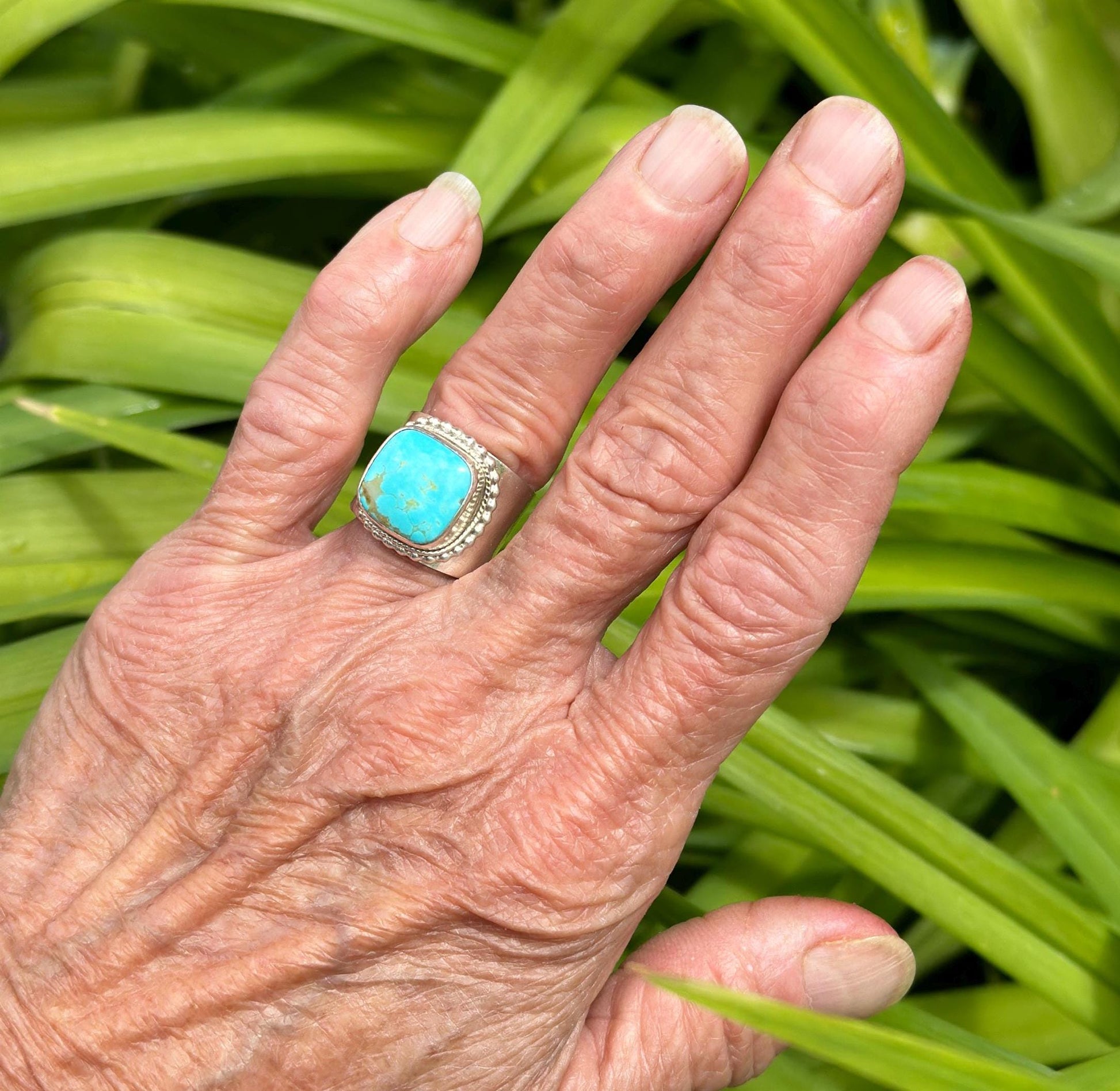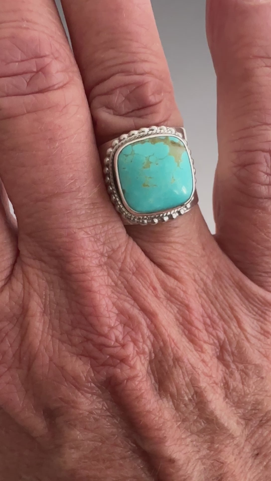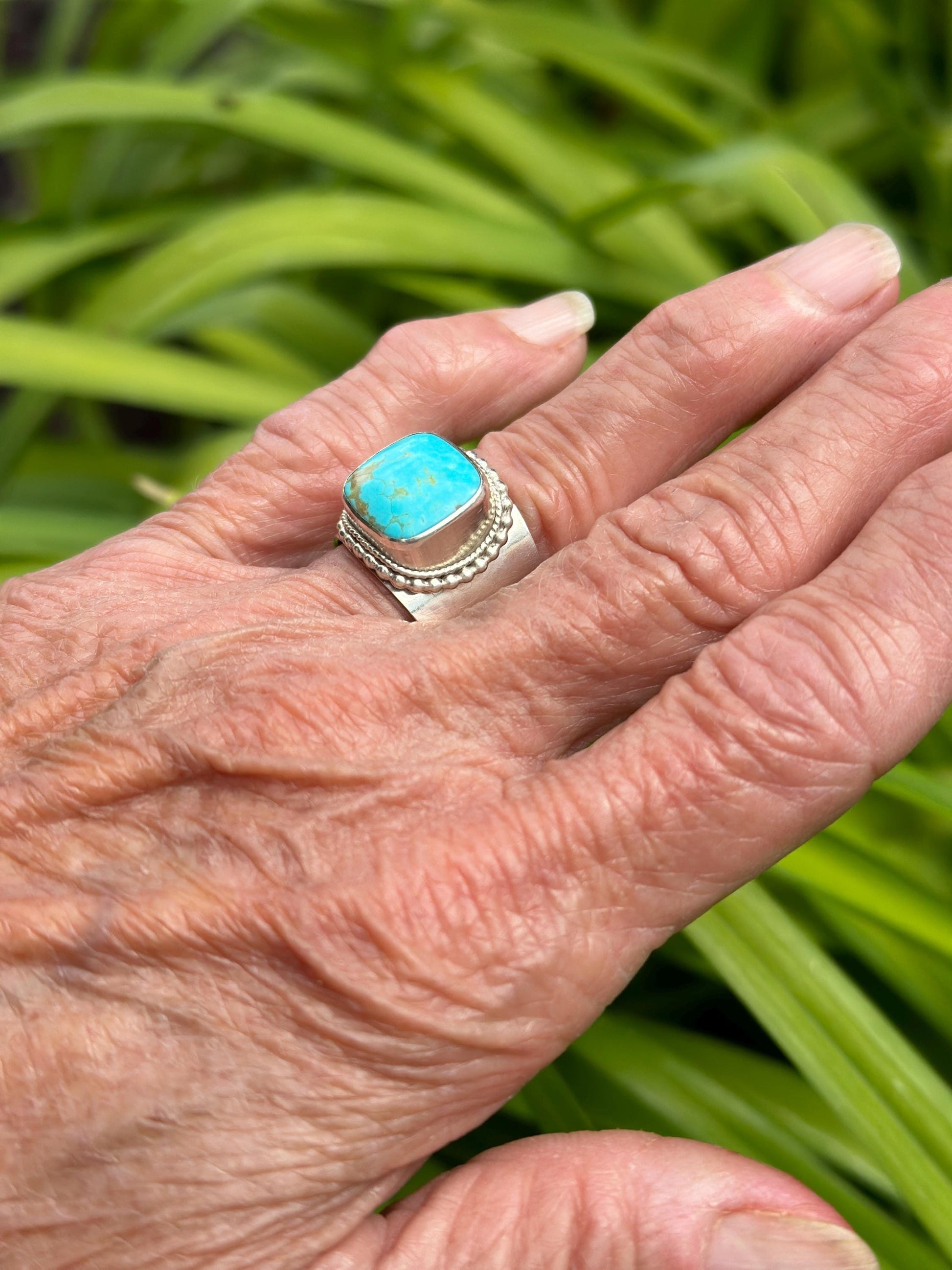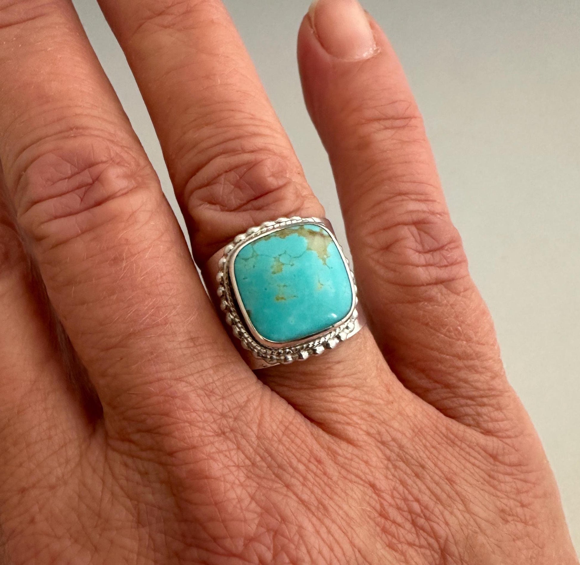 Cushion Cut Kingman Turquoise Statement Ring , Argentium and Sterling Silver Ring with Square Blue Turquoise
