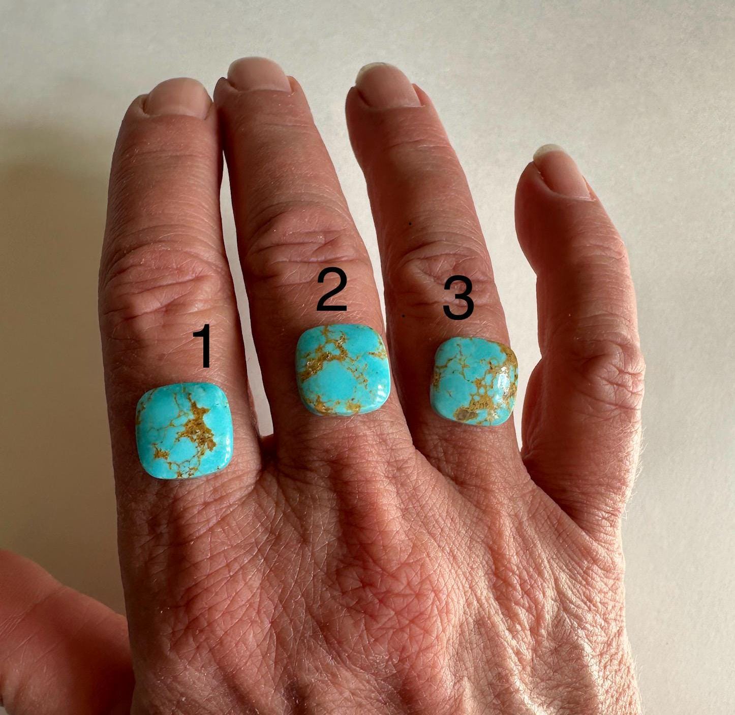 This generously-sized, authentic Kingman turquoise cabochon is presented in a simple silver setting with a mirror finish. The curved bezel sits atop a continuous silver band that narrows underneath for comfort. The ring in the photo has found a forever home, but you can select your own stone (see the second photo, numbered 1, 2, and 3) for your custom piece.