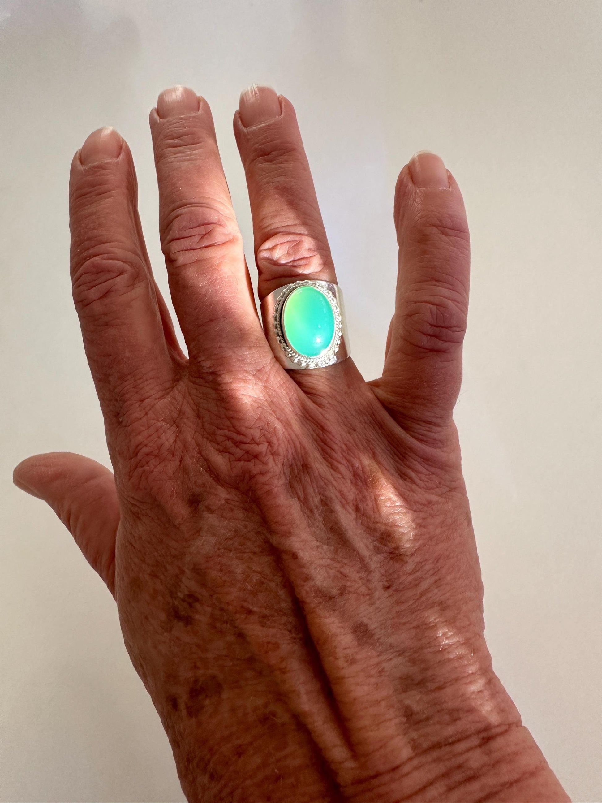 This sterling ring features a stunningly luminous, natural Australian Chrysoprase cabochon. The stone measures 10 x 14mm. It has a curved bezel that rests on a wide continuous sterling band that narrows underneath for comfort. Handmade in Colorado.