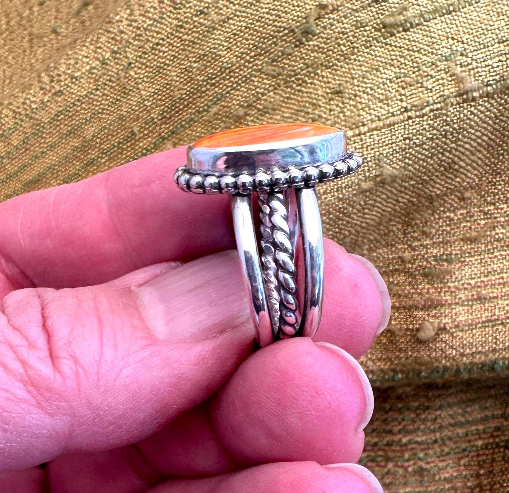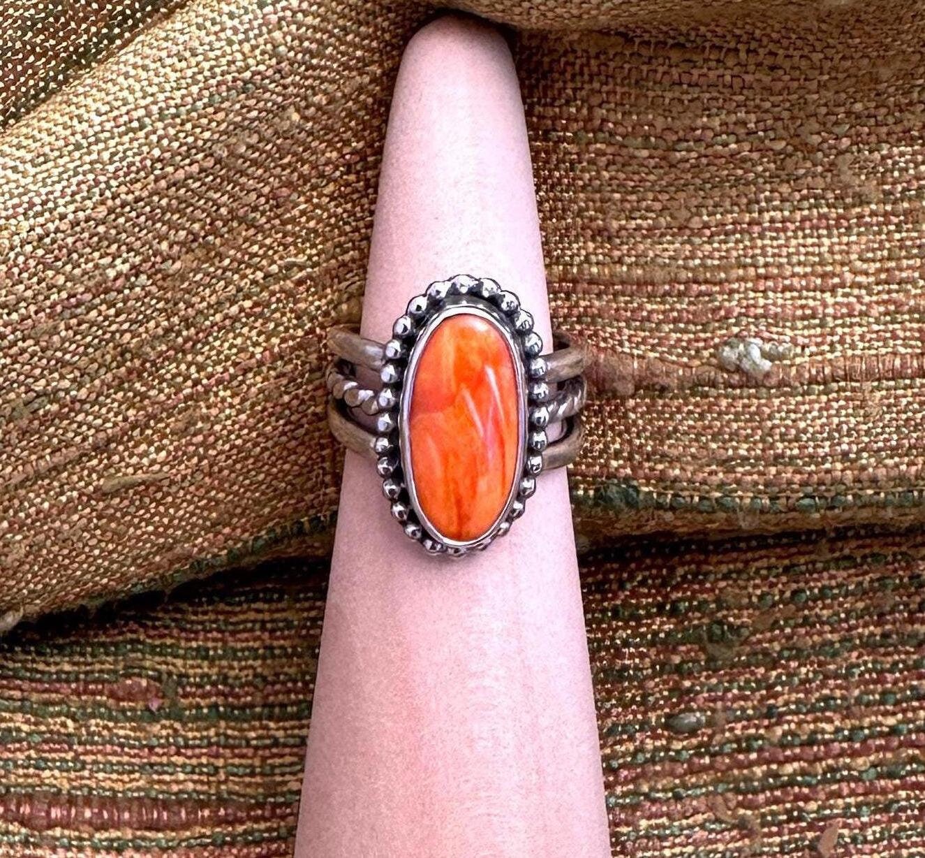 Bold and radiant, this handmade sterling silver ring features a striking oval spiny oyster shell. Its fiery oranges and reds echoing the warmth of a desert sunset. The bezel-set stone is framed in a hand-textured sterling band, blending rustic elegance with eye-catching color. Whether worn as a daily reminder of your wild heart or as a showpiece for special occasions, this ring speaks of sun-soaked mesas and windswept adventures. One of a kind, just like its wearer.