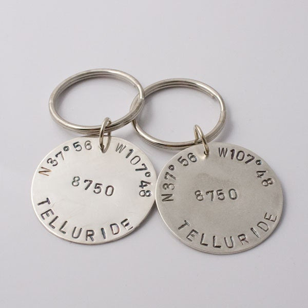 Rustic charm meets refined detail in this keychain, a tribute to adventure and timeless craftsmanship. Featuring a thick, hammered sterling silver tag and your choice of personalization, this keychain includes individually hand-stamped letters and numbers displaying your latitude, longitude, elevation, and location. The characters are darkened through oxidation, creating a simple reminder of a place, a moment, or a feeling you’ll never forget.