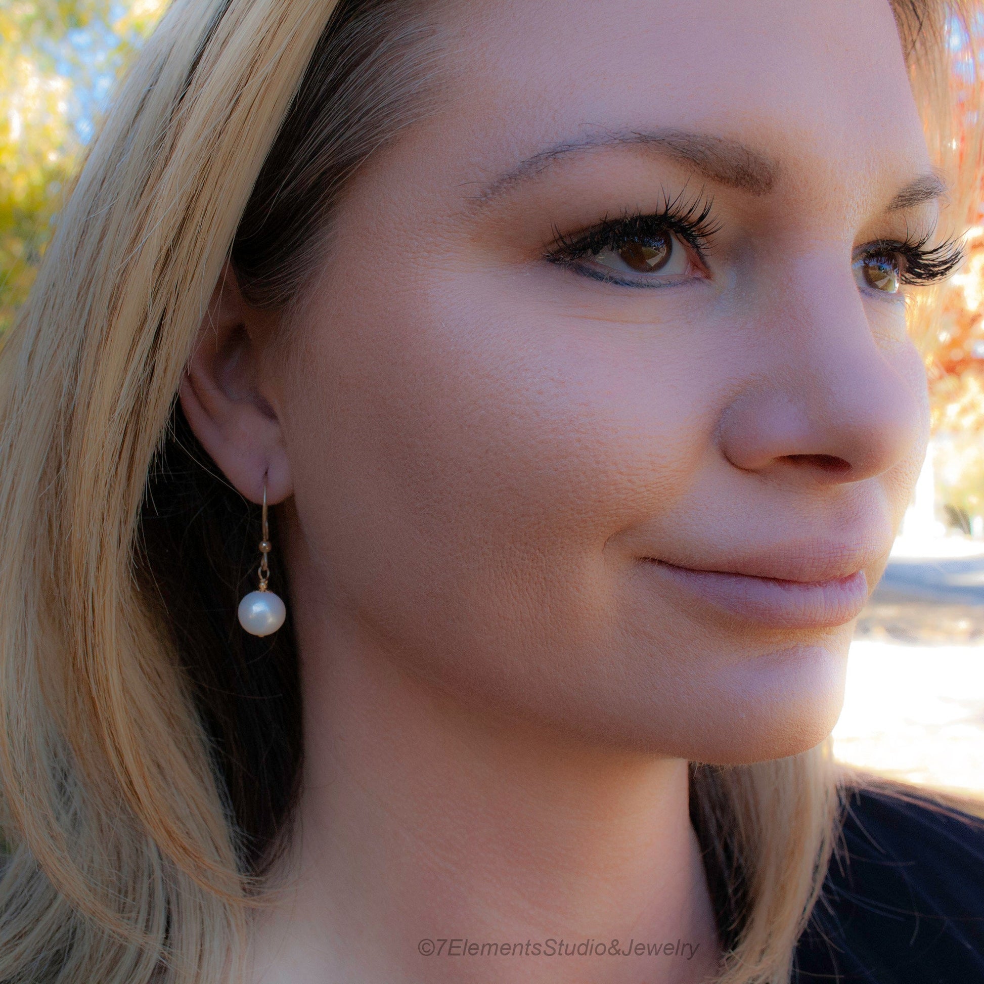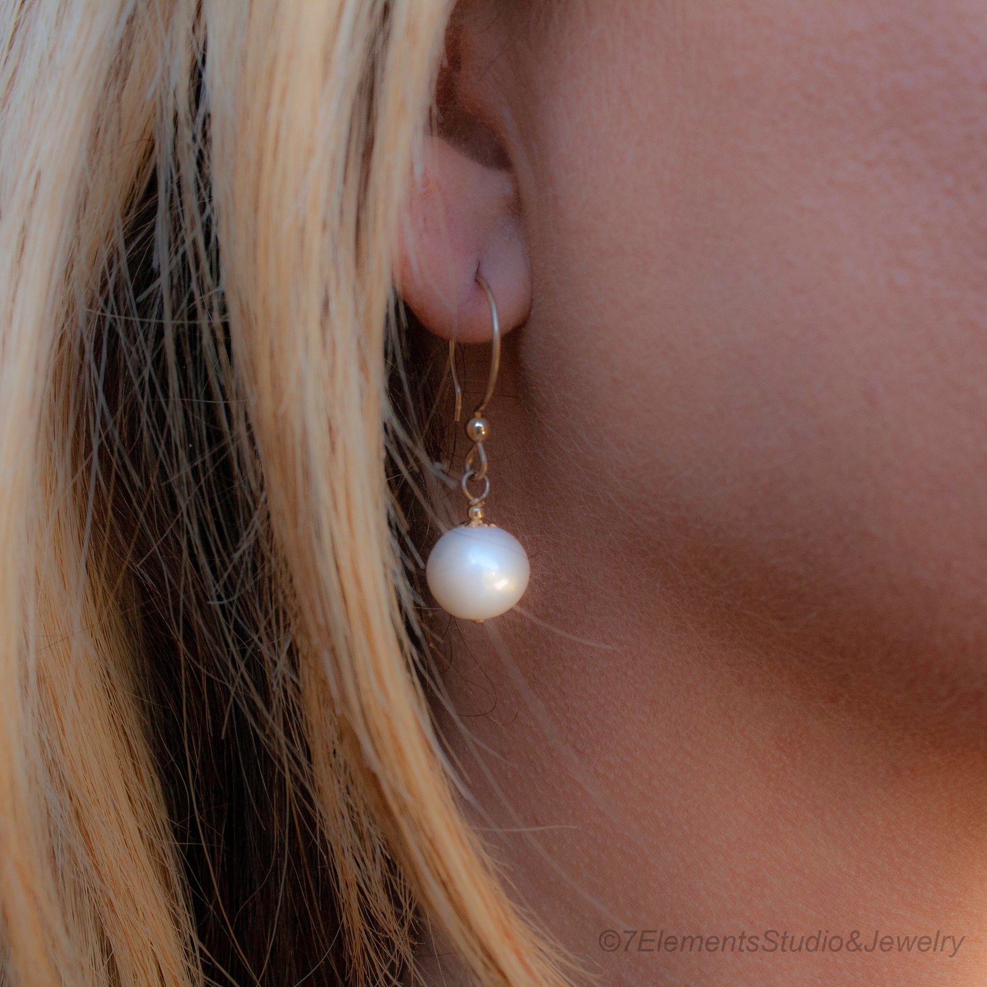 These handcrafted earrings feature luminous white freshwater pearls suspended from 14K gold-filled earwires, offering a timeless elegance suitable for any occasion. Celebrated for their natural luster, pearls are often associated with purity and wisdom.